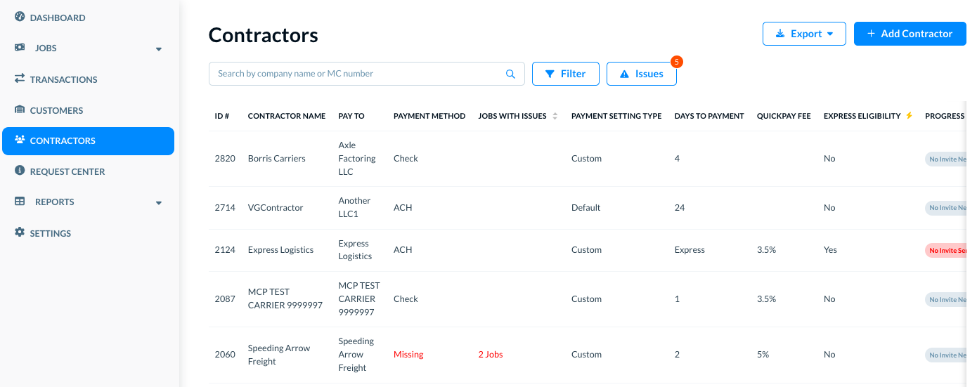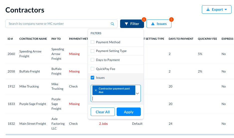 The contractors list shows with the particular issue's filter applied in the list. It shows you a filtered list of only those contractors to whom the payment issue criteria applies.