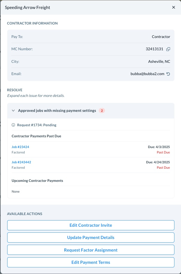 - If there is a pending Factor Assignment or Payment Update request, you see the details of this request.