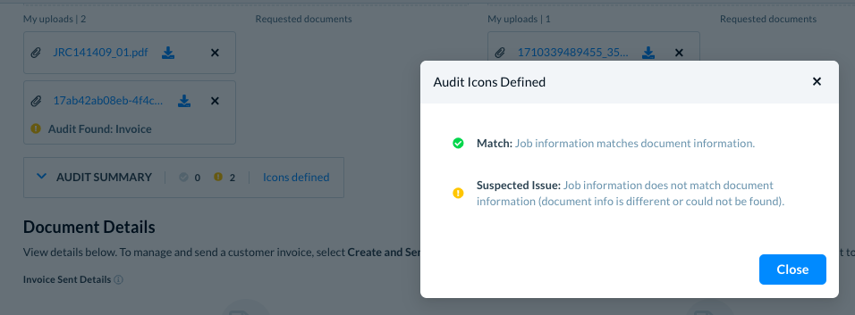 When you add a new job, you can add documents to the job for self-reference. Attach the documents such as the billing documents or any other supporting documents. After you save a job as draft, the option to add documents is available and you can see the audit status, any time.