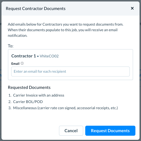 Click on the Request Documents button to request contractor documents. For example you can ask for the carrier invoice with an address, or some receipts of accessories, or any such documents. (Please see Request for contractors' documents for more details.)