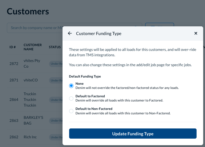 Funding types helps you set up whether a specific customer has a factored or non-factored funding type, by default. It gives you the flexibility to set up different funding types for different customers.