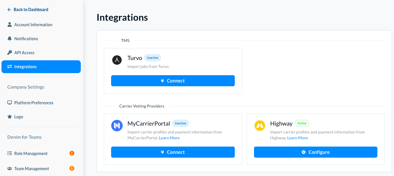 The Integrations page opens where you can set up the integration. (Please see TMS Integrations for more details.)