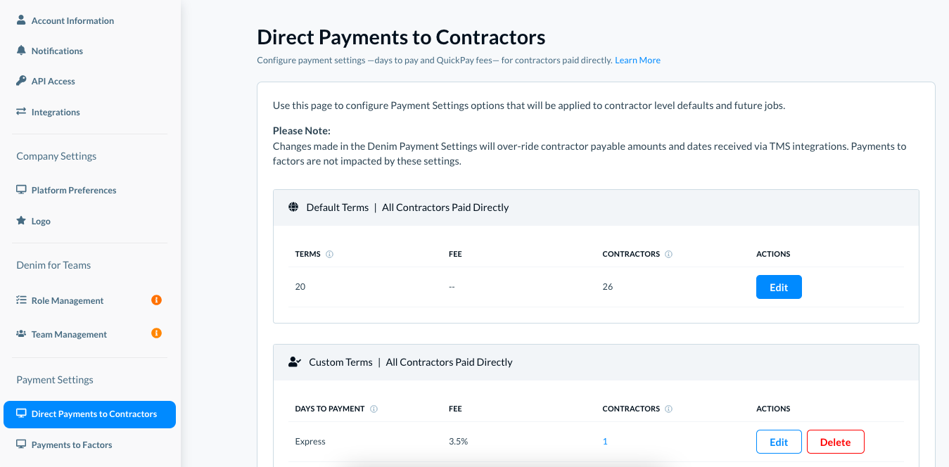 - What are payment settings at your Denim account level, for all your contractors