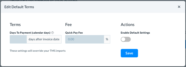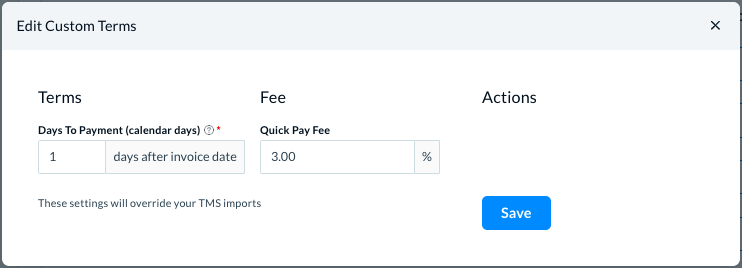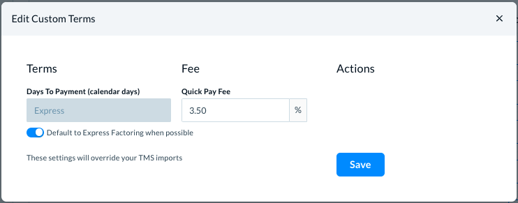 In Custom Terms, you can set up Express factoring for a certain fee for the contractors. (Please see Express Factoring for details.)