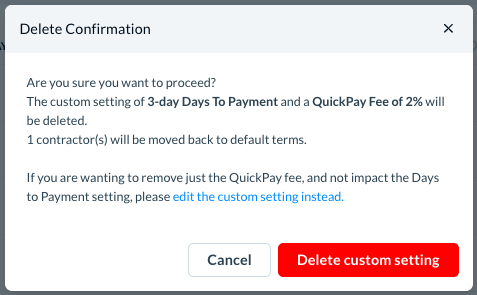 If you delete custom payment terms, all the contractors who have these custom payment terms settings are assigned the default payment terms.