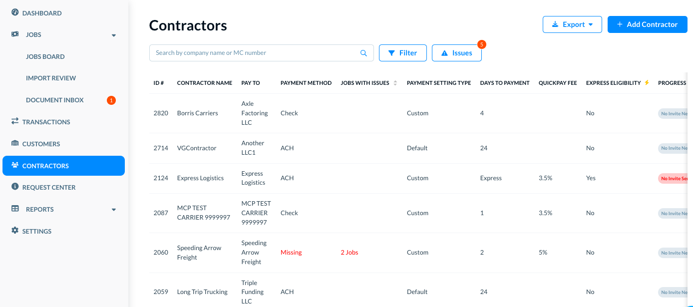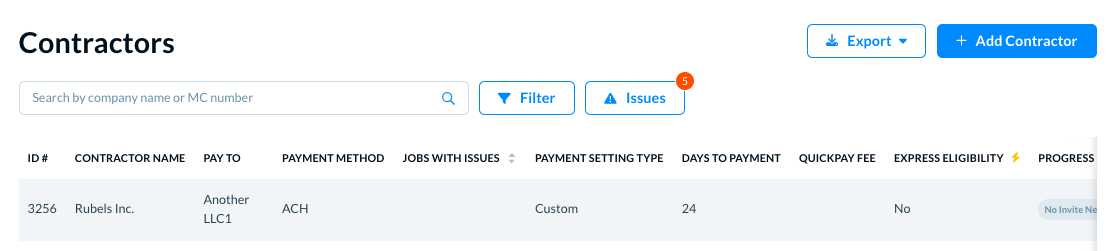 Contractors are anyone whom you pay for their services—they can be carriers, agents, or independent contractors. When you add a new job, adding contractors helps you see the job's lifecycle for the payments.