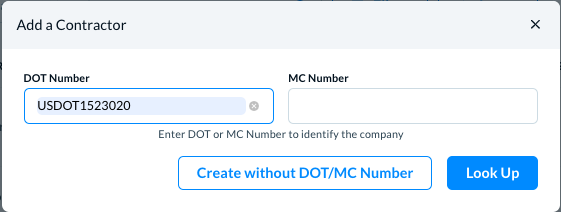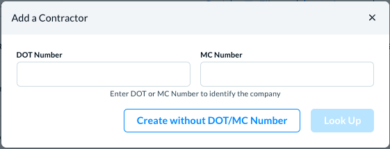 The Add a Contractor modal opens which is the first step to help you find a contractor by their DOT or MC number.