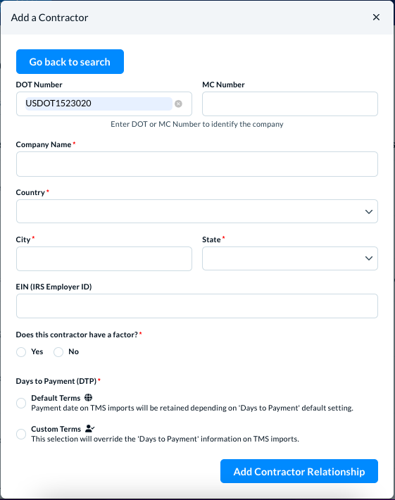 - Steps to add a new contractor in different conditions and use cases—by searching for their DOT Number or MC Number, and whether the contractor has a Factor