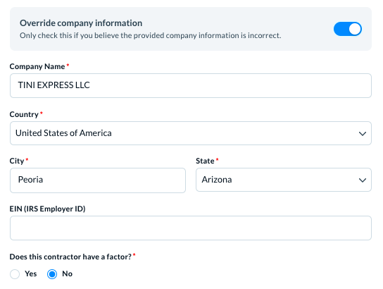 There can be a use case when the form shows the addresses as pre-filled based on the DOT Number that you used to search the contractor. In such cases, Denim gives you an option to override the pre-filled address and change it, if required.