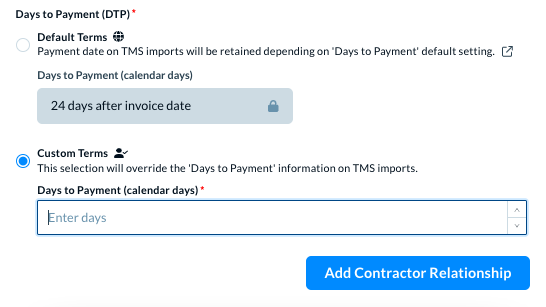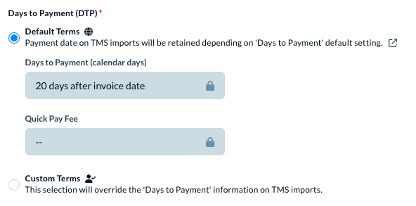 Select this option to apply the default payment terms for this contractor. In some cases, the Default Terms show that the settings are locked, for example as below.