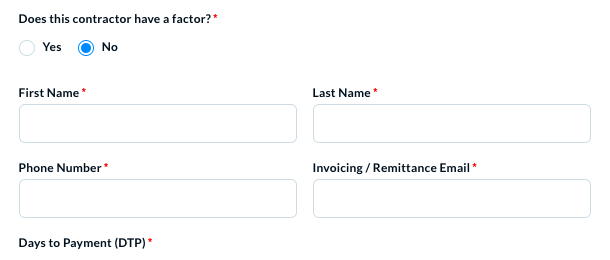 In Does this contractor have a factor, select Yes if you want to assign a factor to this contractor. When you select Yes, additional details appear in the form, as below.