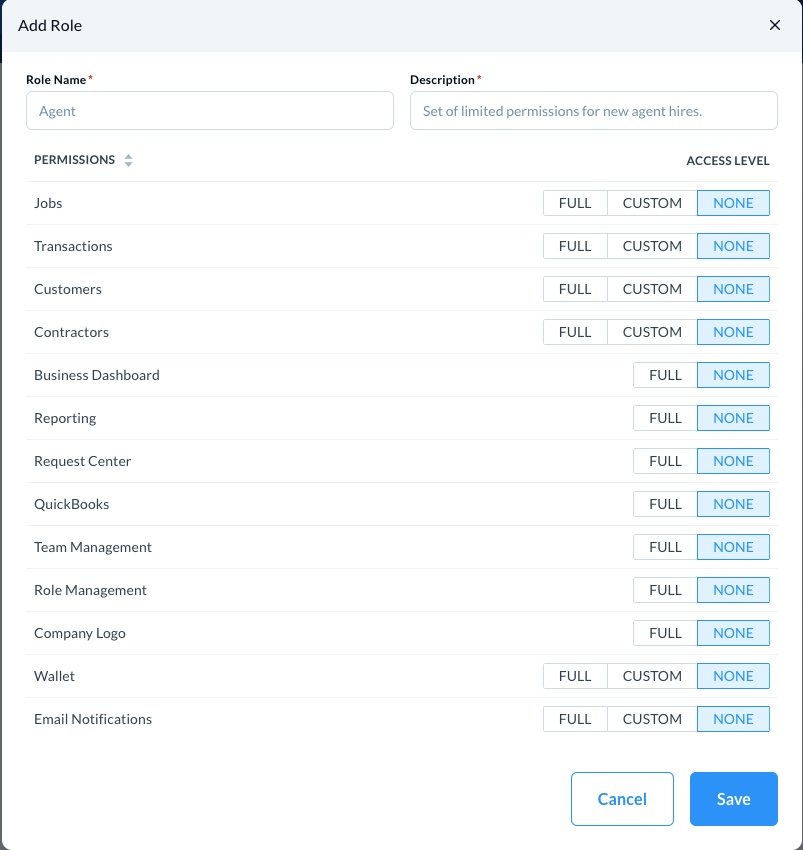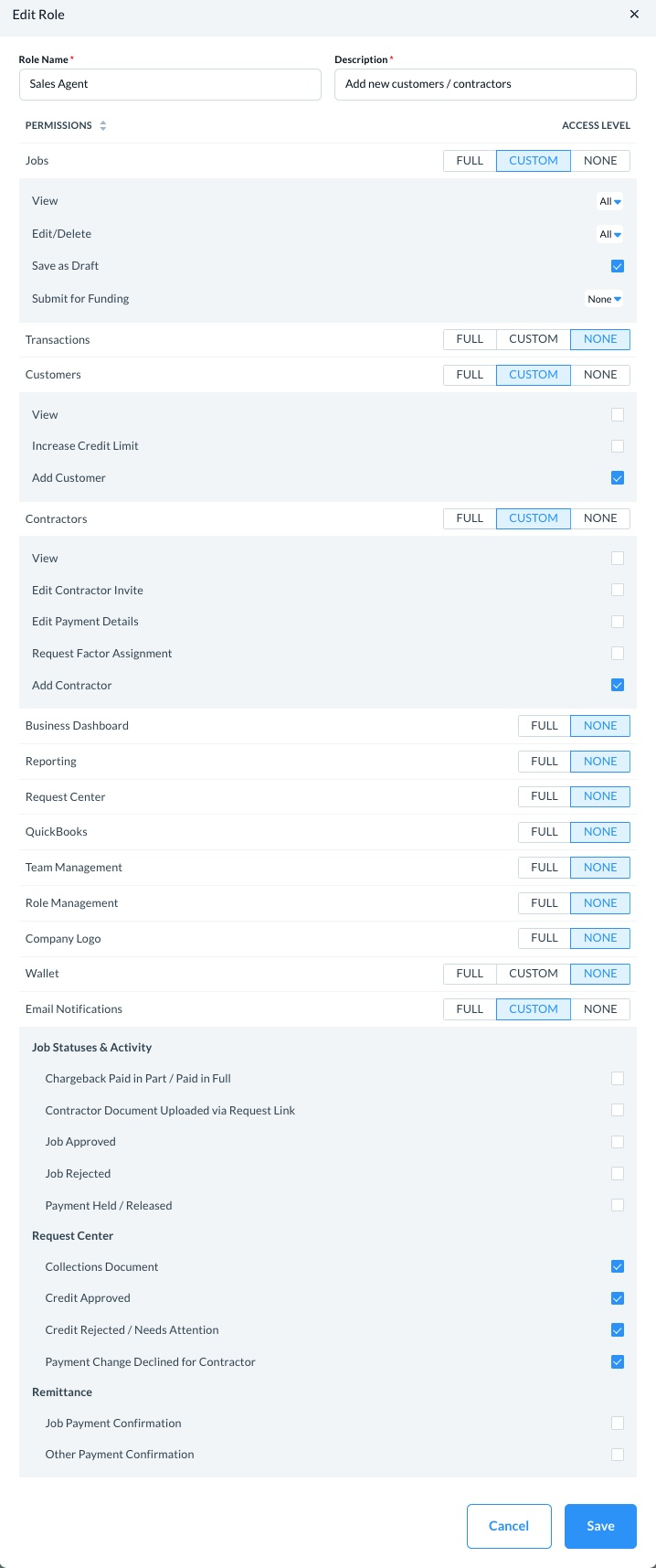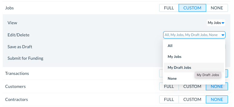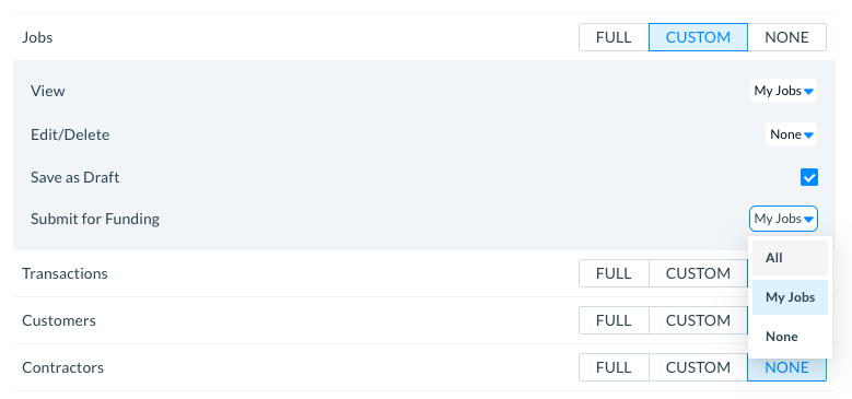 - For example, the user can be allowed full access, custom access, or no access at all to see customers, contractors, jobs, QuickPay, Request Center, invoices, specific reports, the dashboard, users, roles, and so on. This ability allows for flexibility in designing the users' roles and permissions in accordance with your needs and company function.