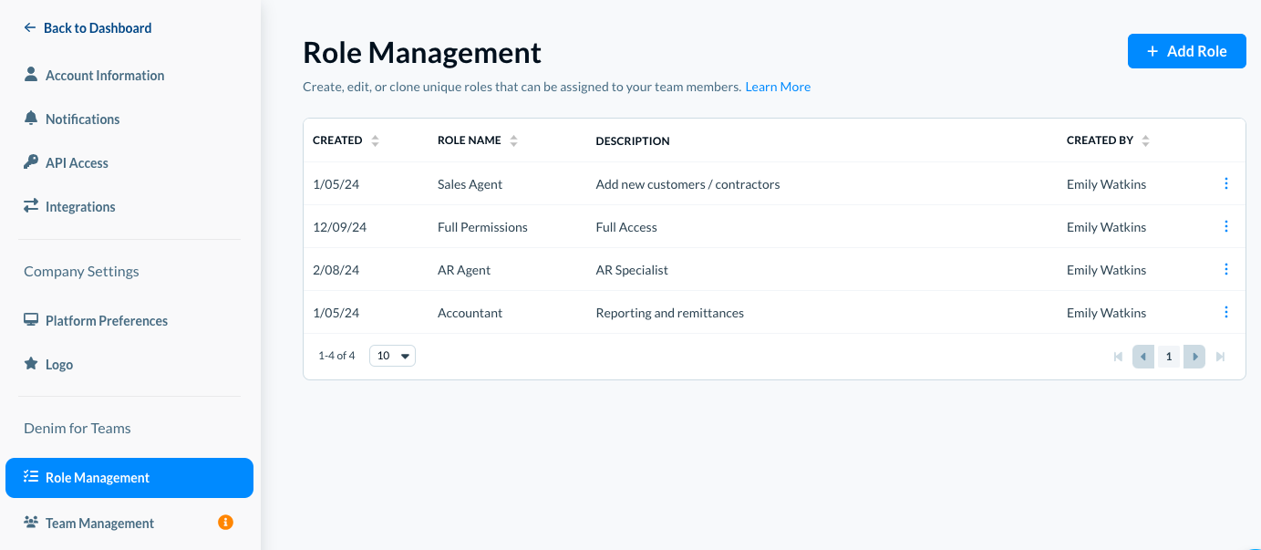 Denim enables you to create and manage roles for your internal operations. For each role, you can define what the user sees and the level of permission the user has when attempting updates on the Denim Account.