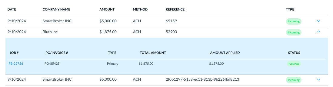 While looking at the list, you can search specific transactions by the company name, the transaction amount, or some reference ID or memo number. You can also filter the list to see all the transactions within specific dates.
