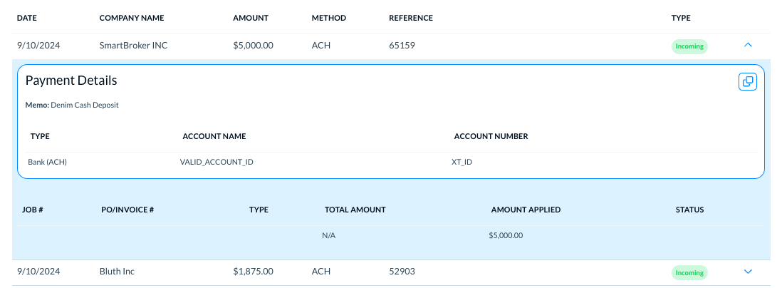 Different types of transactions show different details. For example if the incoming payments are from the customers, or from Denim cash, or if the outgoing transactions are for the contractors. Here are a few examples of different use cases of transaction details.