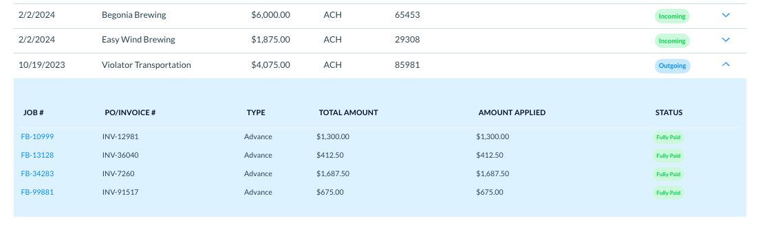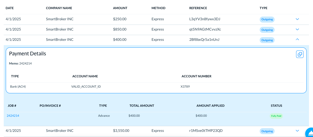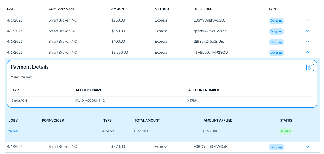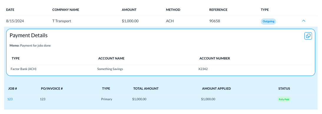 For factored jobs, the outgoing payment transaction details appear as below.