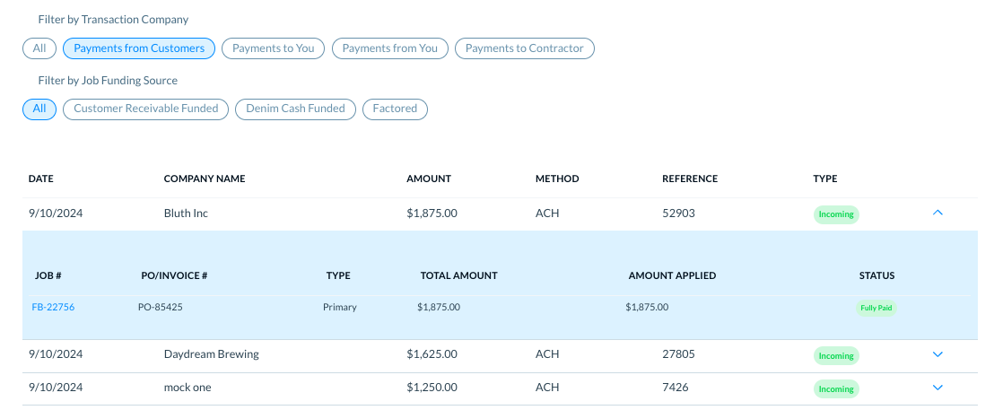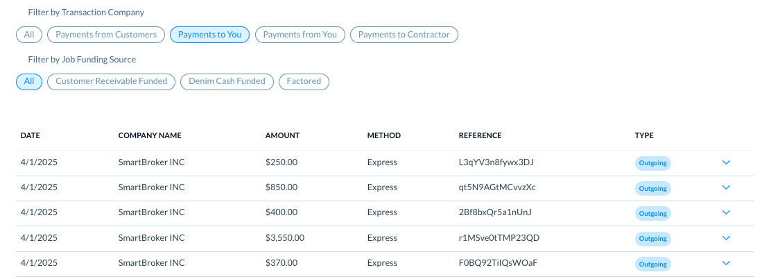 Denim gives you a centralized view to see all the payments transactions in your Denim account. These include all the incoming payments and the outgoing payments.