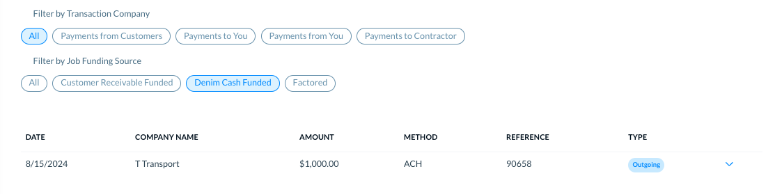 In Filter by Job Funding Source, you can filter the transactions' list based on the source of job funding. For example see only those transactions where Denim cash is involved, or for customer receivables only.