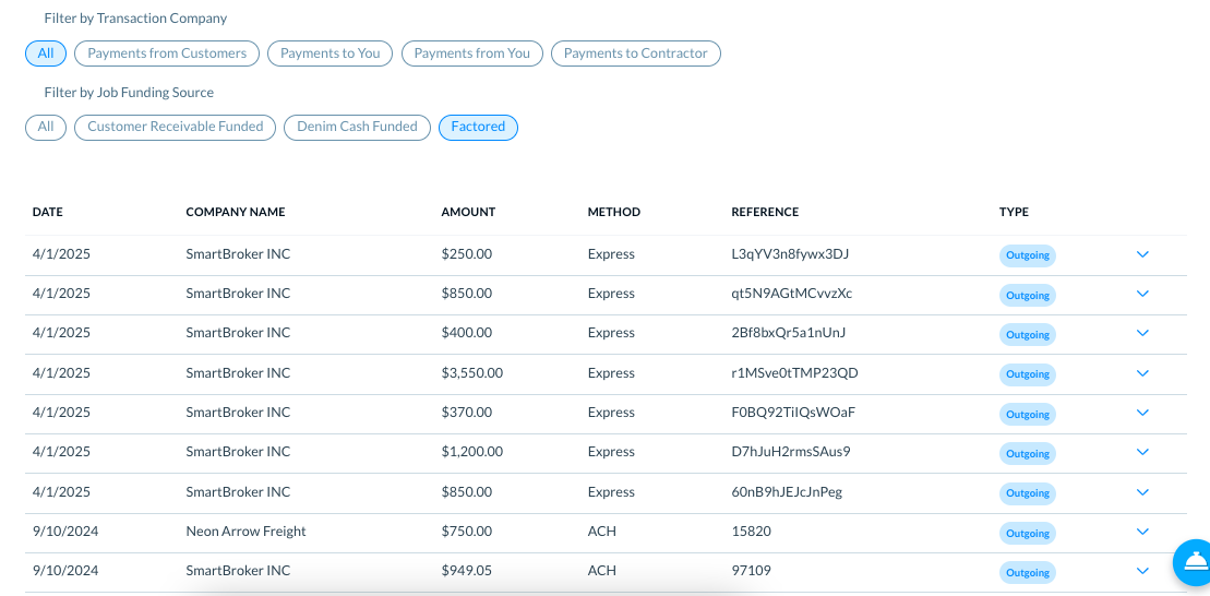 - Express: It shows that Express Factoring was enabled for the contractor during this transaction. (Please see Express Factoring for more details.)