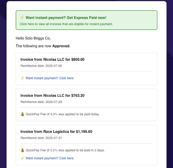 Contractors will also see the option to be paid instantly in their Denim "Invoices Approved" emails: