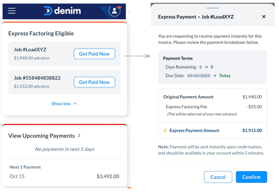 While Denim normally processes advances as next-day ACH, we also offer a way to get paid instantly upon job approval. For example, if you submit a load before 12pm with next-day ACH, you will receive your advance the following day. If you submit a load after 12pm EST, you won't receive payment for 2 business days.