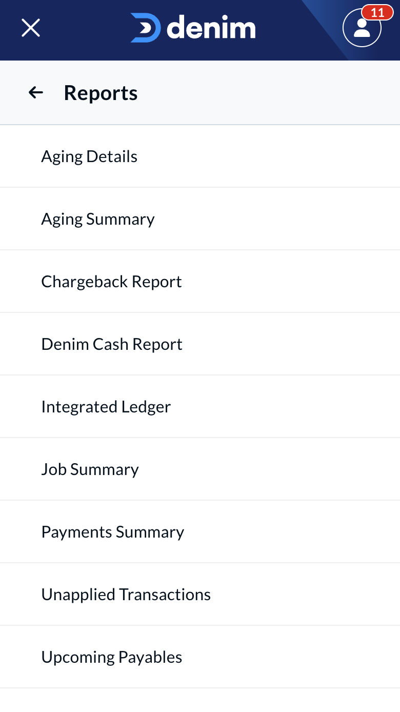 Upcoming Payables is just one of Denim's many reports, which you can find by opening up your side navigation, and selecting “Reports.” Under "Reports," you can view: