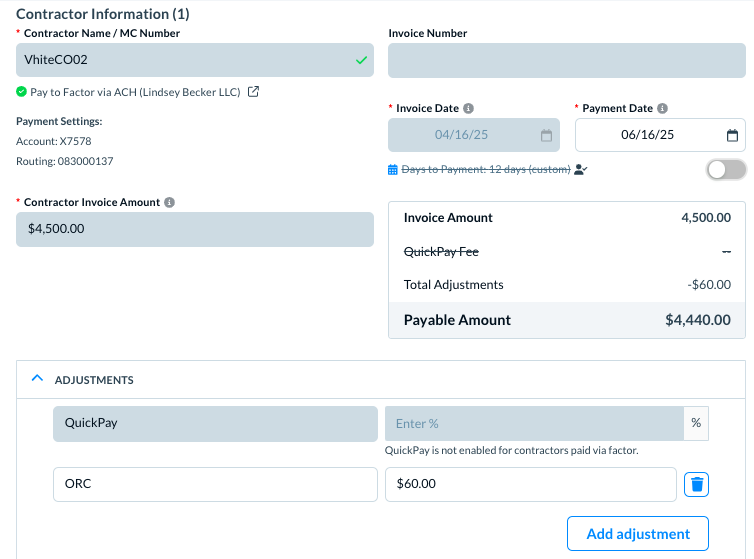 - Days to Payment—whether to keep it custom defined if defined for this contractor