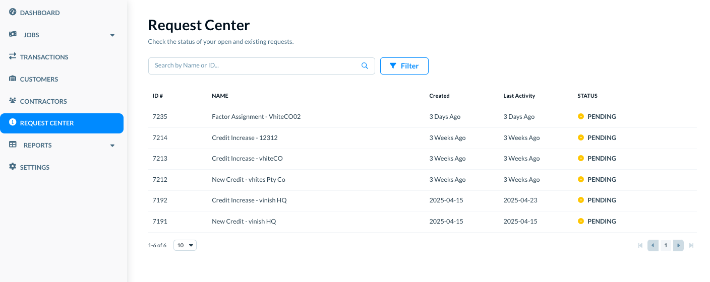 The Denim Request Center is your centralized reference to all the requests that you make, for approvals, for sharing documents, for requests from customers or contractors or Denim, and for other workflow specific activities.