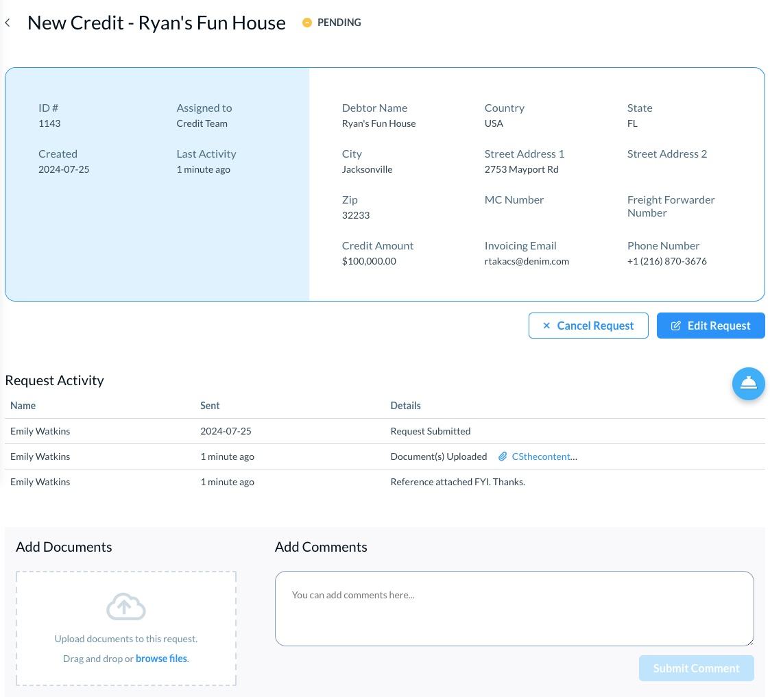 For a request, you can add comments, upload documents, see the activity log of the request, and edit or cancel this request. (Please see Manage and track request details for more information.)